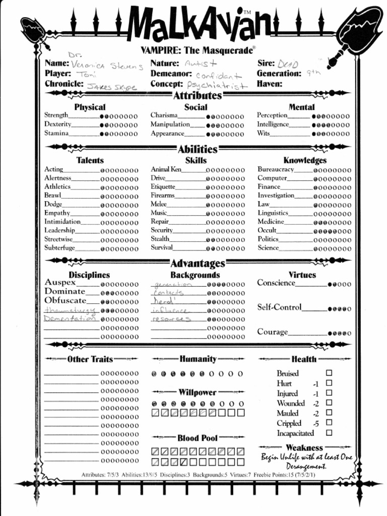 What i was wondering is does anyone know where i can find copies of the character sheets of the npcs (if they exist) or someone had already made a fan version? Create your game and from the character sheet selection, pick vampire the masquerade 5th edition. Vtm character sheet, vampire the masquerade 20th anniversary character sheet, mr gone's character sheet, v20 character sheet generator, vampire the masquerade larp character sheet. A community for collaborative character creation and trading, worldbuilding and roleplay. Check in most recent firefox and chrome browsers.